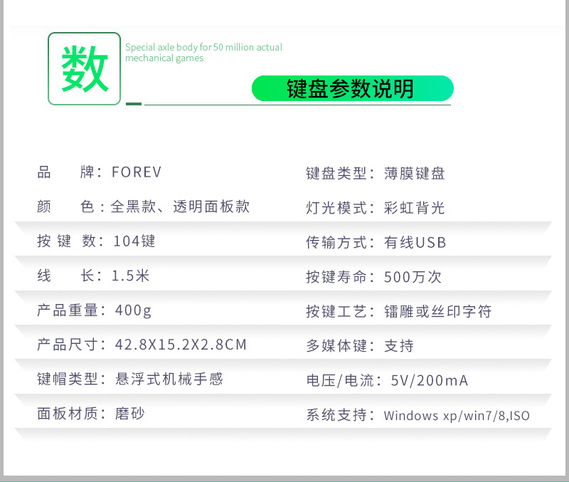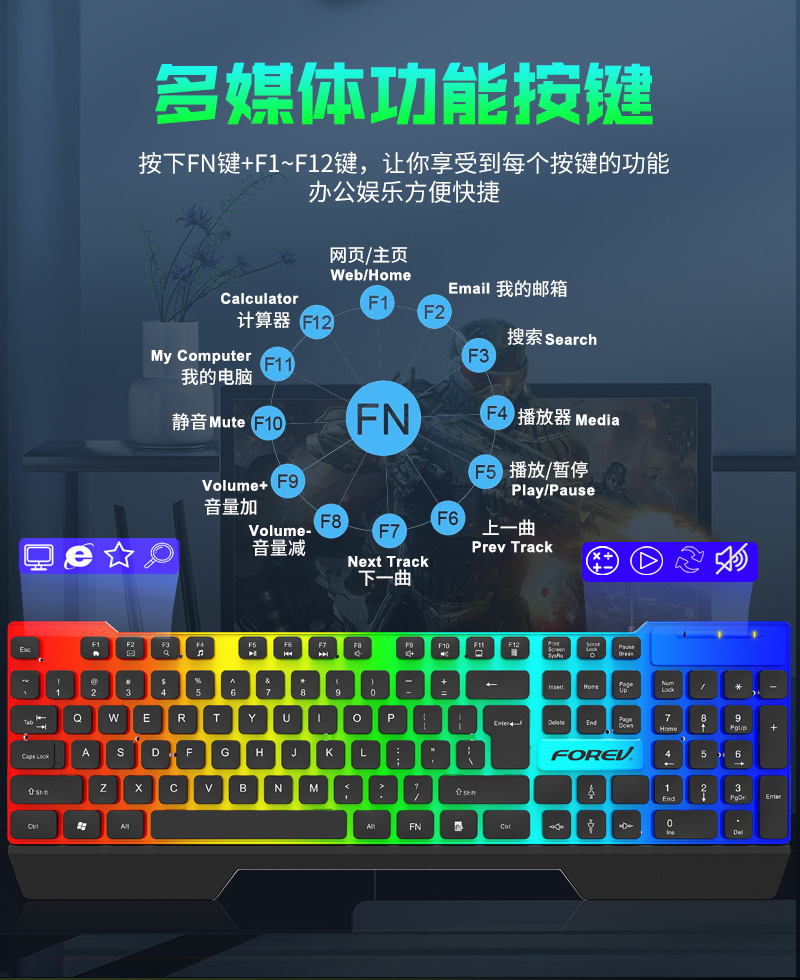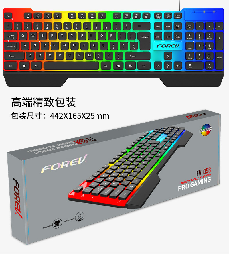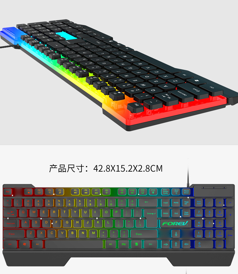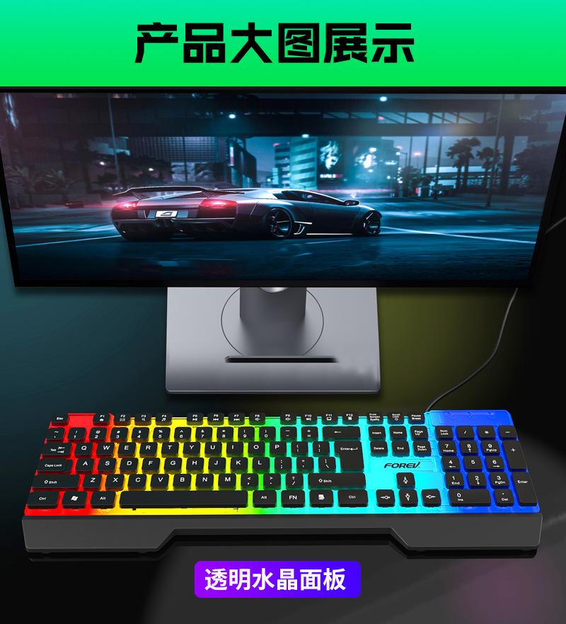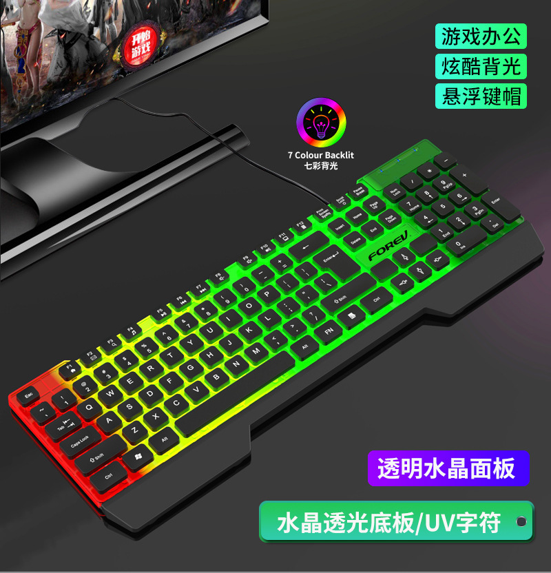 104键发光游戏键盘FVQ1S电竞游戏炫彩光薄膜有线机械手感键盘批发